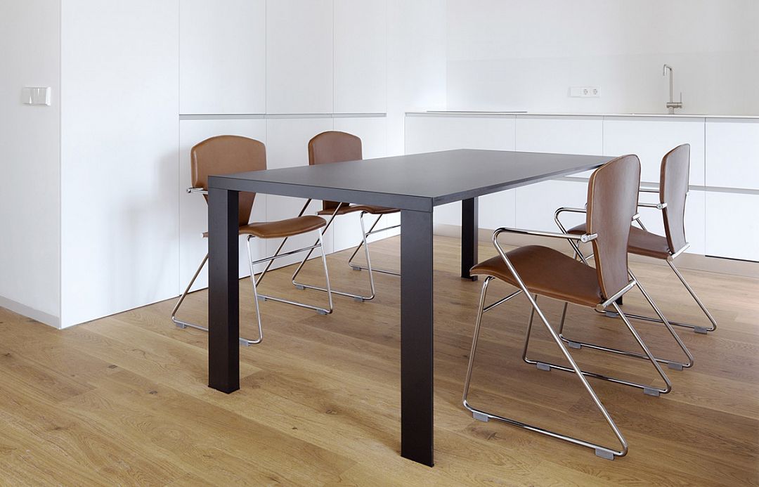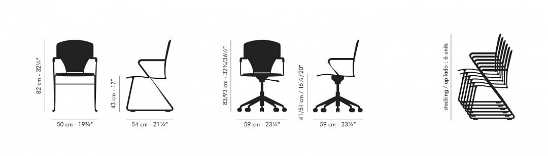 Rám židle je vyroben z chromované oceli; sedák a opěradlo jsou k dispozici v různých dřevěných provedeních.