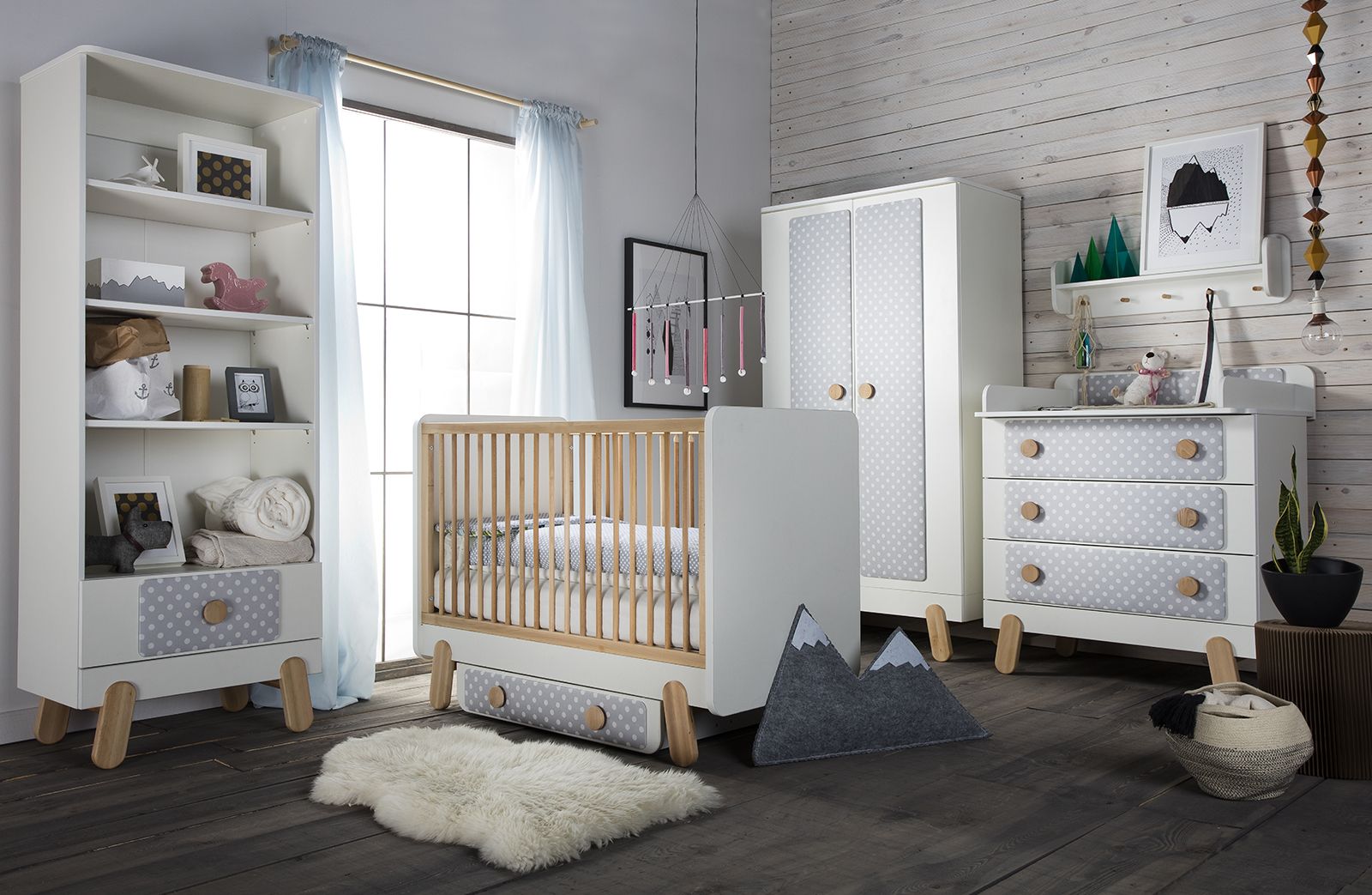 I’ga je kolekce inspirována nesmrtelným Skandinávským designem. Jedním z typických prvků jsou nohy nábytku, díky kterým všechno působí jako pírko. Taky mají všechny kousky zaoblené rohy, a dveře a zásuvky jsou opatřeny tichým zavíráním. Kousky s puntíkovým vzorem jsou odolné vůči zašpinění a potlač můžete bez viditelných stop sundat kdykoliv. Kolekce je vyrobena z kombinace kvalitního bílého lamina a masivního bukového dřeva.
